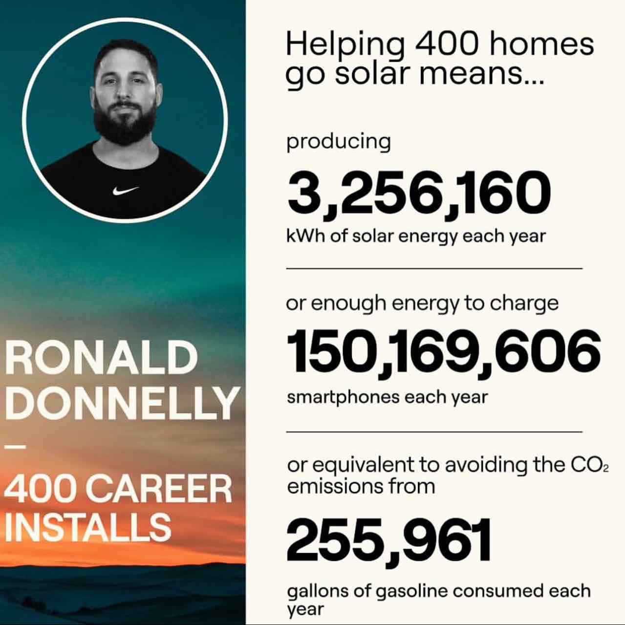 My name is Ron and im a district manager for sunrun. I’ve been working with the company for about 5 years now. Since I’ve started I had two beautiful children, traveled the world and ive installed almost 300 homes. I love what I do because our offering allows homeowners to save money from day one without any out of pocket expense. Im able to help homeowners, clean up the environment and most importantly provide for my family!